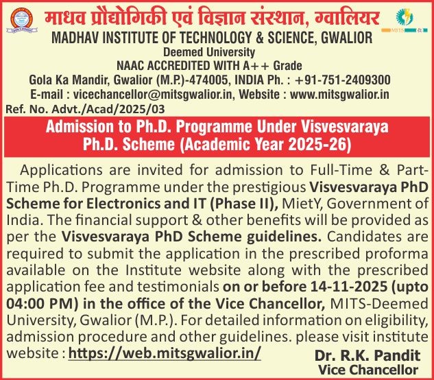 Gola Ka Mandir, Gwalior (M.P.) - 474005, INDIA Ph.: +91-751-2409300, E-mail: vicechancellor@mitsgwalior.in, Website: www.mitsgwalior.in