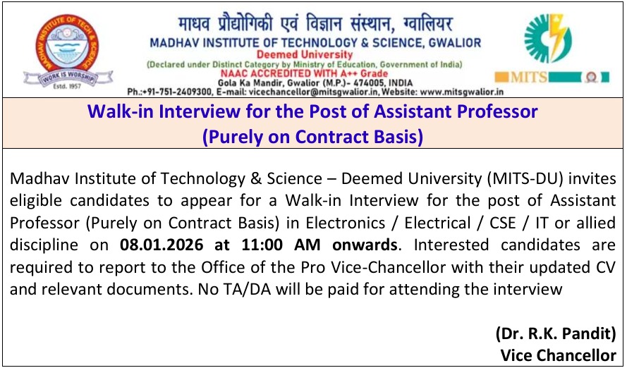 Madhav Institute of Technology & Science – Deemed to be University (MITS-DU) invites eligible candidates to appear for a Walk-in Interview for the post of Assistant Professor (Purely on Contract Basis) in Electronics / Electrical / CSE / IT or allied discipline on 08.01.2026 at 11:00 AM onwards. Interested candidates are required to report to the Office of the Pro Vice-Chancellor with their updated CV and relevant documents. No TA/DA will be paid for attending the interview.
