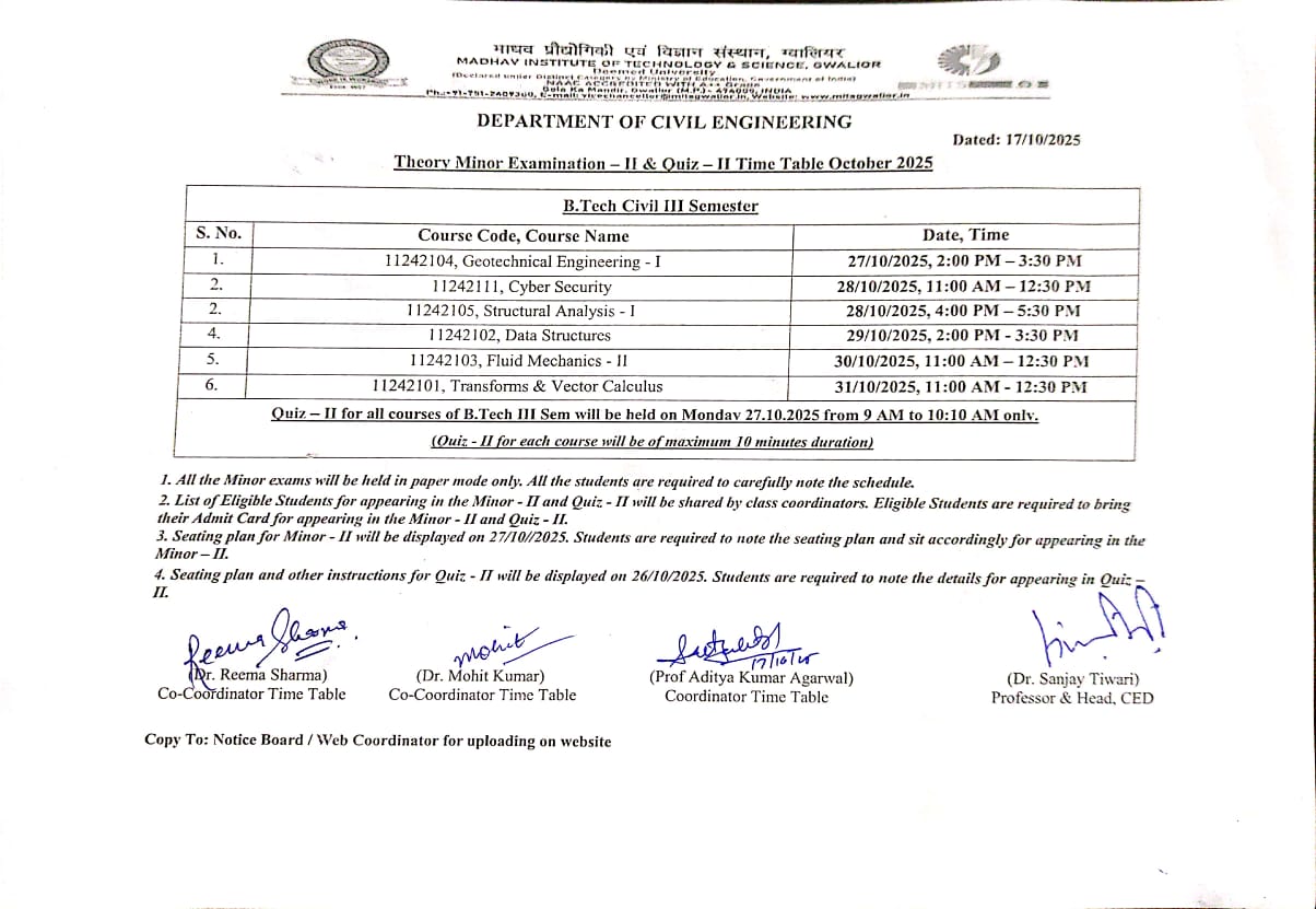 JULY - DEC 2025 SESSION 2nd Minor/ Mid Sem: UG/PG I Sem | UG IIIrd Sem | UG Vth & VII Sem Semester Proficiency BTech II Sem May 2025 Make up (Theory) Evaluation (II Sem UG & PG) - May 2025 Minor - 2 (Theory) Evaluation (II Sem UG & PG) - April 2025 End Sem Practical Exam (Before 2024 admitted batch Regular/N Batch/Ex students) (Ist to VII Sem) - April 2025 Mid Sem Time Table - III (IV & VI Sem Students) - April 2025 Theory Proficiency End Sem Exam (Before 2024 admitted batch Regular/N Batch/Ex students (Ist to VII Sem) - April 2025 Mid Sem Time Table - II (IV & VI Sem Students) - April 2025 Minor - 1 (Theory) Evaluation (II Sem UG & PG) - March 2025 Mid Sem Time Table - I (IV & VI Sem Students) - Februray 2025 Major Evalauation Lab Courses BTech I Sem Jan 2025 ME I Sem Jan 2025 Semester Proficiency BTech I Sem Jan 2025 Theory Minor - II Exam Time Table (I Sem UG & PG Students) - December 2024 End Sem Practical Exam (Before 2024 admitted batch Regular/N Batch/Ex students) (Ist to VIII Sem) - November 2024 Theory Proficiency End Sem Exam (Before 2024 admitted batch Regular/N Batch/Ex students (Ist to VIII Sem) - November 2024 Theory Minor - I Exam Time Table (I Sem UG & PG Students) - November 2024 Mid Sem Time Table - III (III, V & VII Sem Students) - November 2024 Mid Sem Time Table - II (III, V & VII Sem Students) - November 2024 Mid Sem Time Table - I (III, V & VII Sem Students) - September 2024 Mid Sem Time Table - II First Year - May 2024 Special Mid Sem Time Table (II and III students) - April 2024 End Sem Practical Time Table (Ex students) - April 2024 End Sem Proficiency Time Table (Ex students II, III and Final Students) - April 2024 End Sem Practical Time Table (Regular Students II and III Year) - April 2024 End Sem Proficiency Time Table (Regular Students II and III Year) - April 2024 Mid Sem Time Table - II Second & Third Year - April 2024 Mid Sem Time Table - I First Year - March 2024 Mid Sem Time Table - I Second & Third Year - Feb 2024 End Sem Practical Time Table First Year - Jan 2024 End Sem Proficiency Time Table First Year - Jan 2024 Mid Sem Time Table - II First Year - Dec 2023 Mid Sem Time Table - I First Year - Nov 2023 End Sem Practical Exam Time Table Second, Third and Final Year - Nov 2023 End Sem Proficiency Time Table Second, Third and Final Year -Nov 2023 Mid Sem Time Table - II Second, Third and Final Year - October 2023 Mid Sem Time Table - I Second, Third and Final Year - September 2023 End Sem Practical & Proficiency Time Table First Year - July 2023 Mid Sem Time Table - II First Year - June 2023 Mid Sem Time Table - I First Year - May 2023 End Sem Practical Time Table - April 2023 End Sem Proficiency Time Table - April 2023 Second Mid Sem Time Table - April 2023 First Year Mid Sem Time Table - I January 2023 First Year Mid Sem Time Table - II February 2023 First End Sem Proficiency Exam Februrary 2023 First End Sem Practical Exam February 2023 Mid Sem Time Table - I September 2022 Mid Sem Time Table - II November 2022 End Sem Proficiency Exam November 2022 End Sem Practical Exam November 2022 |